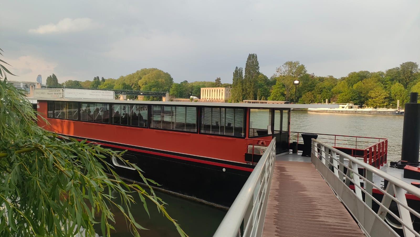 Espace de réception flottant de 175m2, amarré à Saint-Cloud face au Bois de Boulogne.